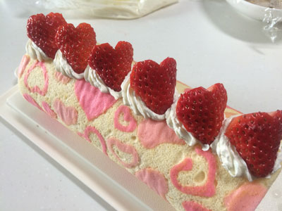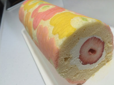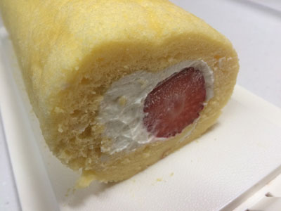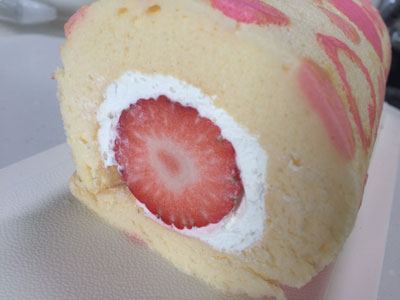 うーなんだか ロールケーキの天板、いつもは28センチ角のものを使っていましたが、25センチのものを買いました。 先日から腰が痛く、まともな動きをしていません。 そのせいなのか、今日はデコロール作れなかった。 25センチの天板は材質が違うのかな?火の通り具合が弱いのか、それとも生地の厚みがある分時間が掛かるのか・・・ 結局焼きが足らず、ちょっと表面がべたつく感じ。 母からもらったイチゴも中心に巻けませんでした。 2015年8本目