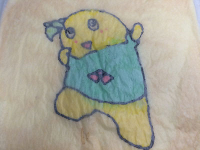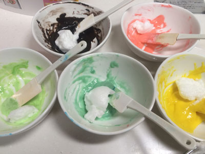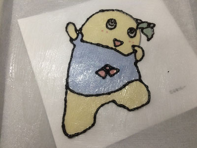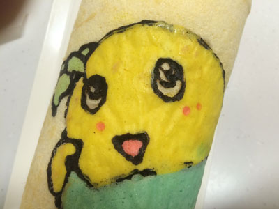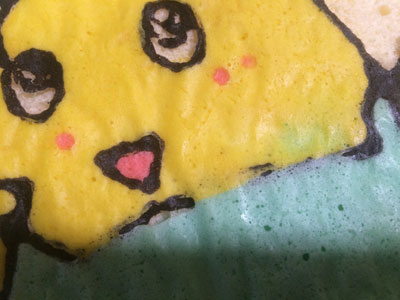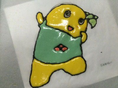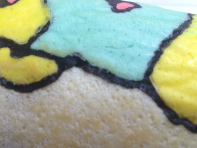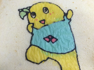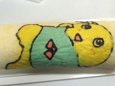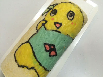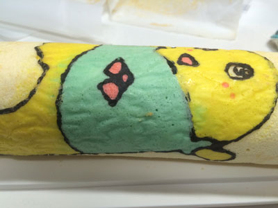 ヒャッハー!! 昨晩、仕事から帰る車の中で決意しました。 よし、明日の朝は『あれ』をやろう! 『あれ』をやるには時間が必要です。 毎朝私は出勤前に晩御飯と息子のお弁当かお昼ご飯を作るので、それだけで時間がかなり掛かります。 それ以外にも家事がたくさんあります。 なので、『あれ』をやるためには、前の晩から翌日の晩御飯の下ごしらえが相当必要になります。 ・・・そして迎えた朝5時半・・・少しだけ晩御飯の仕上げをして、『あれ』に挑戦です。 『あれ』とは、、、『これ』です ふなっしー!! の、ロールケーキ。 前回のロールケーキでクッキングシートを使ったら結構細い線もはがれなかったので、いつかリベンジしてみたかったのです。 前回のふなっしーのロールケーキはこちら 前日に砂糖と小麦粉だけは計量しておきました。 模様を描くためのコルネを作ったり、模様の生地を5種類揃えるのに結構掛かりました。 縁取りの黒い生地、ちょっとやわらかくなってしまい、線が均一にならない(反省点その1) ちょっと身体の色が黄色過ぎた(反省点その2) 黄色の生地を流したら、ほっぺの赤生地が一つ流れた(反省点その3) そして、ベースの生地を流して180度で焼くこと14分 紙をはがす時はドキドキです。 うまくはがれた!!やっぱりこういった入り組んだものはシリコンシートよりもこっち! 前日にカスタードクリームを作っておいたので、生クリームをホイップしたものと混ぜて、ロールに巻きます。 いいじゃないの! 前回はベースの生地部分と模様部分の境目が割れましたが、今回はGOOD! もうテンション上がります。 ちょっと細いので、全体が写りません。 そして、黒の線部分の下にまで黄色と水色の生地が入ってしまったり、ちょっと混ざってしまいました。(反省点その4) それでも、ちょっとうまく模様が出来るようになってきたのでよし!! 全部作り終わるまでに1時間半以上掛かりました。 もう1回やったらもっとうまくいく気がする!! 2015年6本目のロールケーキでした!