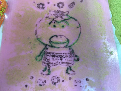 はながっぱのロールケーキ はながっぱのロールケーキ焼きました。今年3本目 模様はブラックココア、1分30秒焼いてからベースの生地を流します。 焼きあがった感じ、シートを剥がすのが緊張 ・・・模様がうまくはがれませんでした。 ほとんどシリコンシートにくっつきました。 リカバリーです。ほとんどお絵かき(笑) 生クリームと大納言小豆巻きました。 デコロールは続けて焼かないとちょっとのコツもすぐに忘れてしまいます。 ・・・で、はながっぱって、、、何? よく知りません・・・
