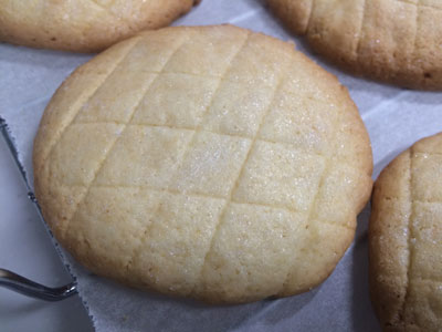 メロンパンの皮焼いてみました(メロンパンの皮のレシピ) 最近巷で話題のこれ『メロンパンの皮焼いちゃいました。』 これを研究してみたいと思います。 これ食べた感じはベーキングパウダー入ってるな。 あれこれ試作をしてみることにした◆試作第1号 無塩バター 50グラム 薄力粉 115グラム ベーキングパウダー 小さじ2分の1 砂糖 50グラム(40グラムから変更) 卵 30グラム バニラエッセンス グラニュー糖 180度15分 これ結構上の製品に近い気がする! (砂糖は50グラムに変更) ◆試作第2号 無塩バター 50グラム 薄力粉 80グラム アーモンドプードル 35グラム ベーキングパウダー 小さじ2分の1 砂糖 50グラム(40グラムから変更) 卵 30グラム バニラエッセンス グラニュー糖 くるみ 25グラム ちょっと甘みが足りない感じ アーモンドプードル入れたのでちょっとしっとり系 クルミが美味しい これはこれで美味しいと言われた。 (砂糖は50グラムに変更) もうちょっとざくざくしててもいいと会社のお客さんのM田さんが言ってたので、次回は試作1号に強力粉を15グラム、薄力粉を100グラムにしてみる。 砂糖も48グラム(20%増し)にしてみる M田さん用に倍の大きさのを作ってみる ◆試作第3号 無塩バター 100グラム 薄力粉 210グラム 強力粉 25グラム ベーキングパウダー 小さじ1 砂糖 100グラム 卵 60グラム バニラエッセンス グラニュー糖 強力粉ってすごい! 食感がすごく変った! 今回は1号2号の倍量で作ってみた。 砂糖の分量もこれでよし M田さん用に倍量も作ってみた 1号~3号どれもいい感じです。 好みの食感に合わせて作るとよし。 さすがに3日続けて作ったら笑われた。 でも、続けて作らないと前回の試作を忘れてしまうでしょ PR