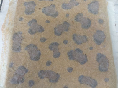 ヒョウ柄ロールケーキ 本日はヒョウ柄に挑戦です。 ヒョウ柄は下絵が必要ないです。 適当に1色目を置きます、1分焼いてから2色目1分。 実はベースも1色目2色目もどれもコーヒーで着色しているので、色の違いがあまり出なくて、慌てて2色目を濃くしました。なので?ちょっと2色目がゆるい生地になっちゃった。 焼きあがりました。 思ったよりはいい感じですが、ちょっと反省点が。 一つは柄が大き過ぎ。そして、模様生地がゆるかったので焼きあがったらちょっとかたい感じ。 もう1回挑戦だな。 小さい型を使ったのでやっぱりL玉だと生地が厚め。ゆっくり巻いたので割れなかったけど、『の』の字にはならない・・・ 2015年 21本目