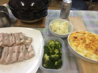 忘年会みたいな・・・ 予定していた忘年会が新年会に延期になってしまいました。 作ってみたい料理があったので、会社の社長とお客様のM田さんと3人で忘年会みたいなものをやりました。 鶏肉をハーブで下味つけて、ベーコン巻いて、ゼラチンで固める。 美味しいけど、決定打が無い感じ(笑) あとは土鍋ご飯炊いて味玉おにぎり。冷蔵庫にあった海老でグラタン。 マッシュポテト。 来年もみんなでワイワイ食べたいです。