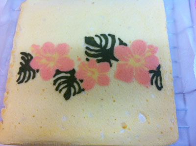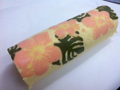 ハイビスカスのロールケーキ 2014年 9本目と10本目 姪っ子の誕生日、本人の希望で中は生クリームとイチゴ(あまおう) かなりうまくいったけど、葉っぱの抹茶が多すぎたため濃い・・・ まだ色のつけ方は練習が必要です。。。花の部分は食用色素の赤だけど、今回はまぁいい感じ♪ やばい、楽し過ぎます! あまおうが残ったので、おうち用にもう1本