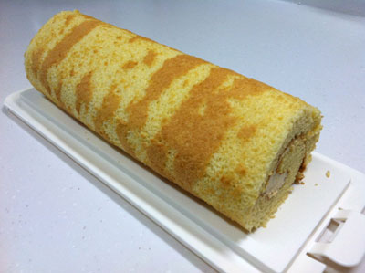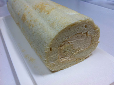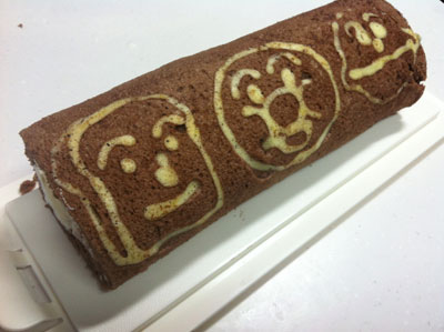 アンパンマンのロールケーキ 2014年12本目 先月のアンパンマンのロールケーキに再チャレンジ 中は生クリームとバナナ 巻きがイマイチうまくいかなかった。 シリコンシートをはがしてから、乾燥防止のためにまたシリコンシートを被せておくのだけど、その間に蒸気がこもって模様がはがれやすくなる気がするので、そのあたりの按配が微妙・・・ まだまだ修行が必要・・・