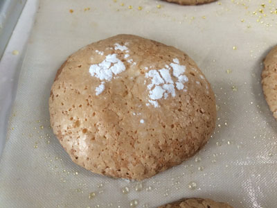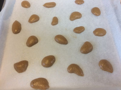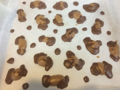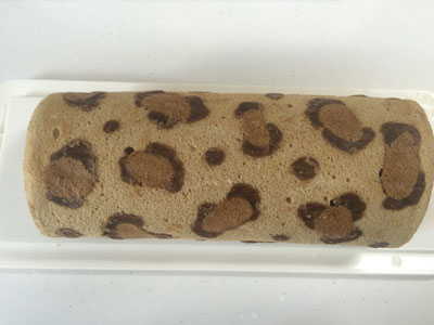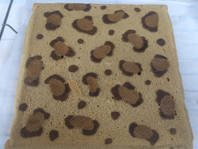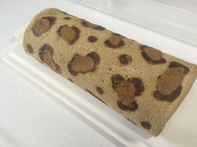 ヒョウ柄ロールケーキ 本日はヒョウ柄に挑戦です。 ヒョウ柄は下絵が必要ないです。 適当に1色目を置きます、1分焼いてから2色目1分。 実はベースも1色目2色目もどれもコーヒーで着色しているので、色の違いがあまり出なくて、慌てて2色目を濃くしました。なので?ちょっと2色目がゆるい生地になっちゃった。 焼きあがりました。 思ったよりはいい感じですが、ちょっと反省点が。 一つは柄が大き過ぎ。そして、模様生地がゆるかったので焼きあがったらちょっとかたい感じ。 もう1回挑戦だな。 小さい型を使ったのでやっぱりL玉だと生地が厚め。ゆっくり巻いたので割れなかったけど、『の』の字にはならない・・・ 2015年 21本目