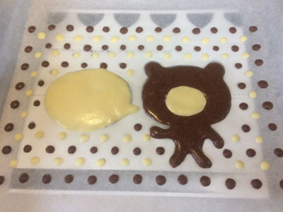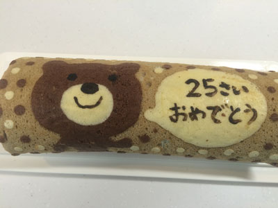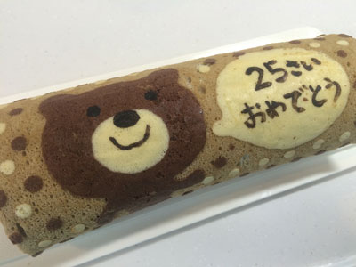 クマのメッセージ入りロールケーキ 姪っ子の誕生日なので、ロールケーキです。 今回はクマのメッセージ入り 模様生地は2色なので楽チンです。 焼きあがったらブラックココアを水で溶いて、目鼻口と文字を入れます。 ここのところ順調です。 生地はコーヒー味(模様生地はココア) 中はコーヒー入りのシロップを塗って、生クリーム巻きました。 2015年20本目